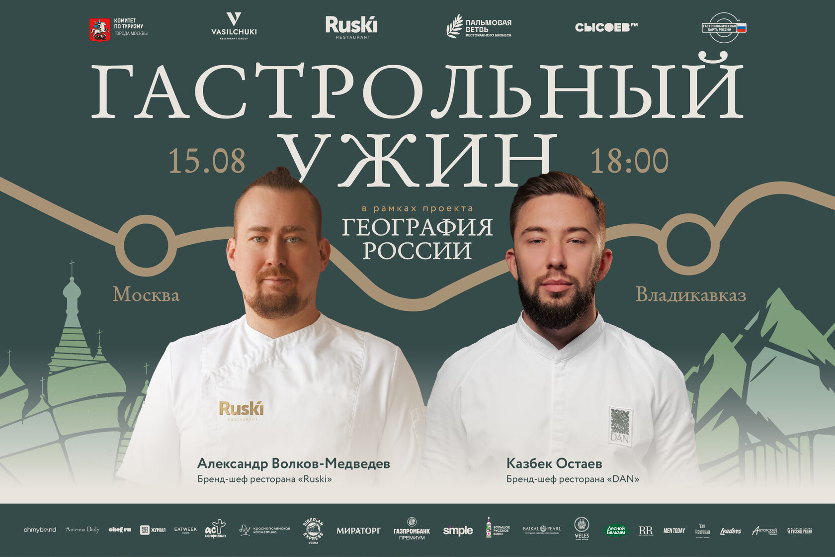 Ресторан RUSKI (354 Restaurant Group by Vasilchuki) при поддержке Комитета по туризму города Москвы и Гастрономической карты России продолжает федеральный проект «География России». Восьмой гастрольный ужин проекта состоится 15 августа во Владикавказе, где команду во главе с бренд-шефом Александром Волковым-Медведевым будет принимать в гостях ресторан DAN.